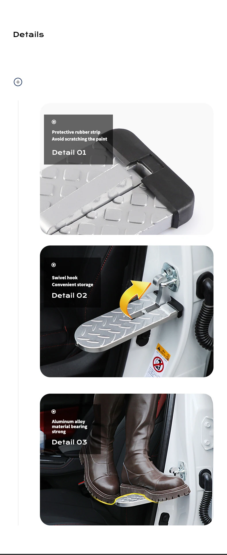 1. Car safety door steps: Designed with multiple protective soft rubber pads, no need to worry about paint damage at fixed points.