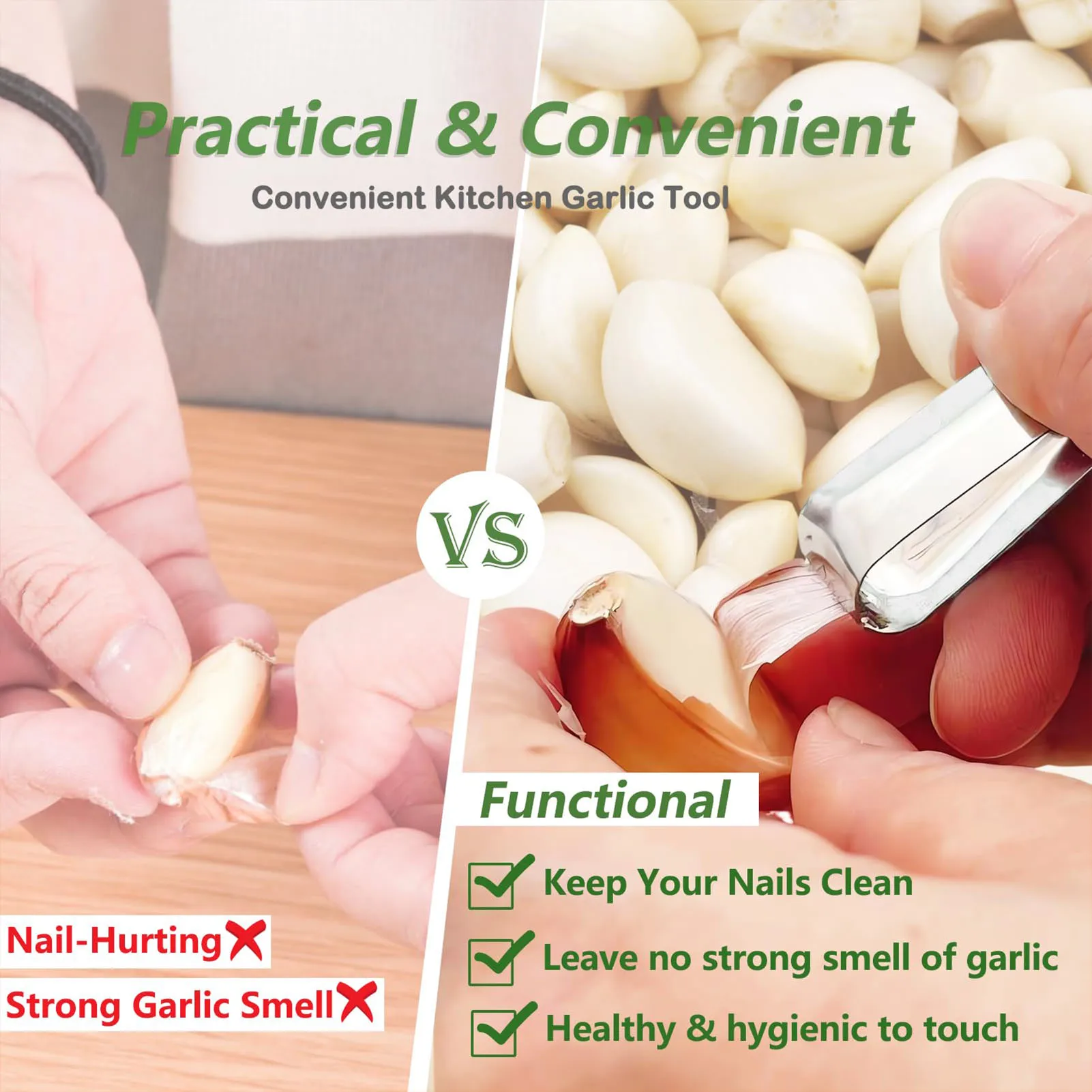 Effortless Garlic Peeling: Our handheld tool features a unique design that effortlessly removes garlic skin without the need to touch the cloves, keeping your hands odor-free and your nails intact.